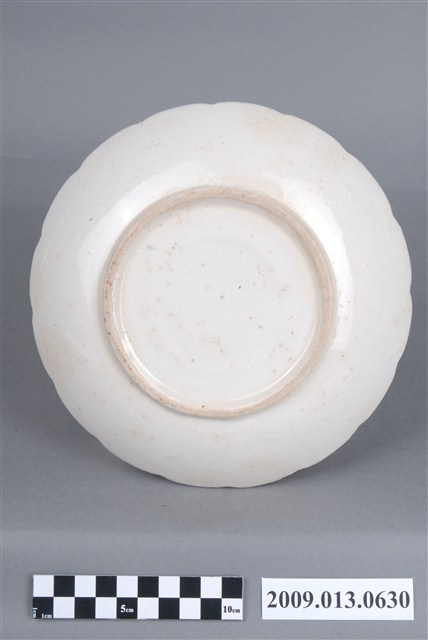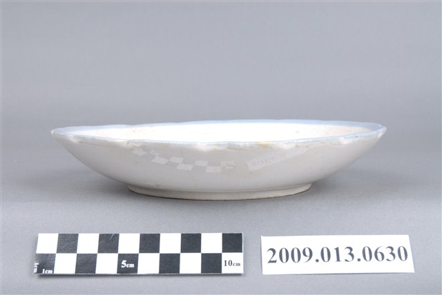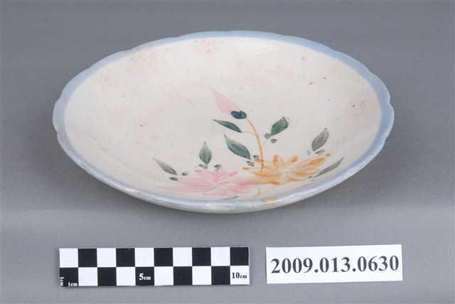 圓盤。白陶,仰鏇壓法製作,無底款。此圓盤用以裝盛菜肴。平底,圓腹,葵瓣邊,圓唇,以覆式鏇壓法製作,低圈足,圈足內有三圈同心圓。無款識,臺灣鶯歌地區金振陶瓷工廠的製品。白陶胎質。全器以釉下彩繪裝飾,器緣飾以一道淡青邊,主要紋飾略偏在右下方,彩繪折枝花卉。以褐色細線條畫出枝條,綠色畫出橄欖形的葉片。下方畫上兩朵粉紅色與橙色的花朵,花瓣也呈橄欖形,上方有粉紅色的長形花苞。全器施以透明釉,釉面有開片與斑點。此作品的主題以多彩表現,畫面有程式化的現象,主題花卉並非寫實,成為這類作品的重要特色。
