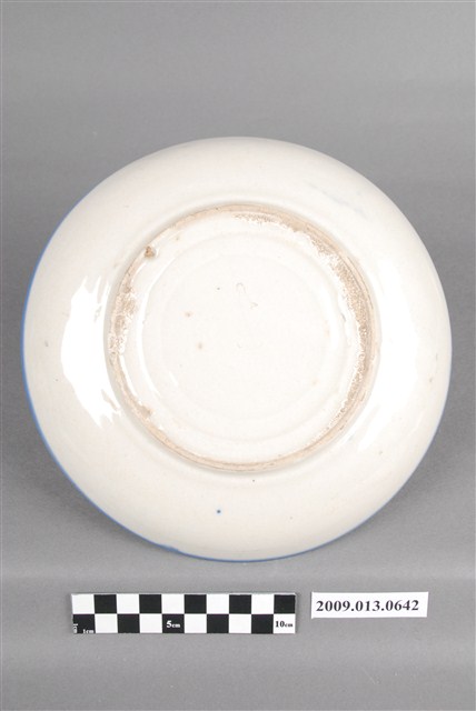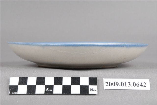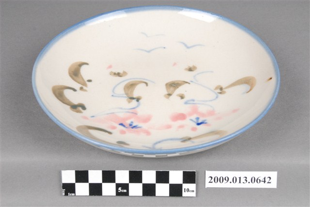 圓盤。白陶,覆鏇壓法製作,無底款。此圓盤用以裝盛菜肴。平底,圓腹,圓唇,低圈足,圈足內有三層同心圓。無款識,臺灣北部地區的製品。胎質細緻,但未達瓷化程度,為白陶質。全器以釉下彩繪裝飾,器緣畫上一道淺藍色的邊線。器面中間飾以折枝花卉,畫面中間偏下方有兩朵粉紅色的花朵,以青花色點出花蕊,上下兩端以青花畫上主枝與細枝,周圍有幾片褐色的弧形葉片,最上方還畫有兩隻V字形的青色飛鳥。全器施以透明釉後入窯燒製,釉面潔白。全器在青花粉紅彩之外,使用褐彩。整體結構顯得鬆散,各個部分有飄浮在空中的感覺。沒有描繪具象的花卉,是這類產品常見的風格。
