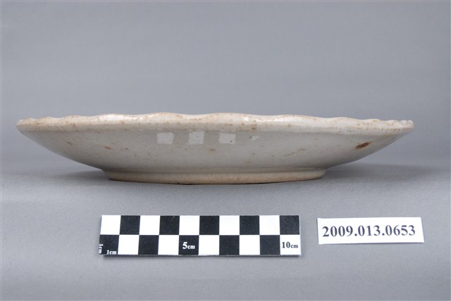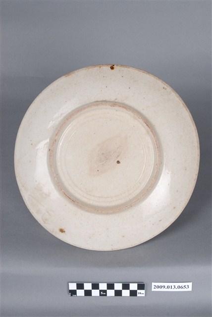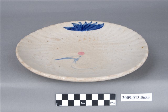 大圓盤。白陶,覆式鏇壓法製作,無款識。圓形盤用以裝盛菜肴,業界稱為「白鶴盤」。平底,弧腹,圓唇,波形緣,低圈足,圈足內有三道同心圓。無款識,生產的窯場不詳,但為鶯歌製品。胎質未達瓷化程度,屬於白陶質。全器以覆式鏇壓法製作,正面的淺浮雕團鶴紋由藝術家設計後,製成模具,鏇壓之後,正面即印有團鶴紋。鶴首在畫面中央,下方有一塊波濤紋,身體與翅膀很有規律地佈滿畫面,具有相當的節奏感。施以白色化粧土後,由畫工用青花色料簡單地畫上頭部、眼睛與尾翼,再用粉紅彩點上丹頂後,施以透明釉燒製而成。釉面有細碎的開片,並有少許針孔與色斑。這種裝飾技法可以量產,效果良好,很受市場歡迎。這種產品仿自日式同類產品,在鶯歌生產。