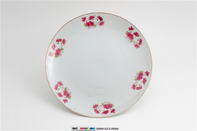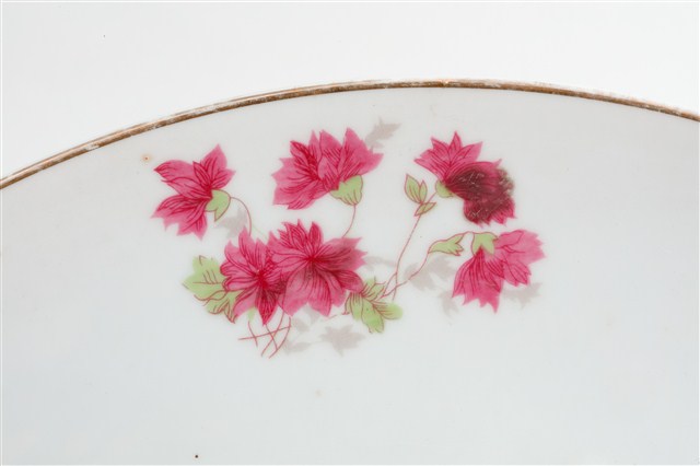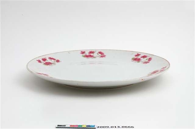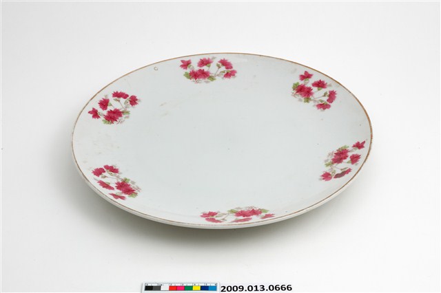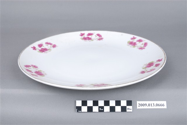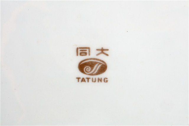圓唇侈口,弧壁下斂至圈足,圈足露胎。口沿以金彩描邊,盤壁內側轉印六組同樣構圖的花卉紋等距布排。桃以淡綠色釉彩烘托出桃紅色花朵的豔麗,色調安排上清麗典雅。花卉紋底以淡色釉襯底,使得桃紅釉料更為跳脫,構圖上較有層次不死板單調。以六組花卉紋裝飾盤緣是臺灣早期生產的瓷器上常見的裝飾手法。盤底有褐色「大同TA TUNG」商標。