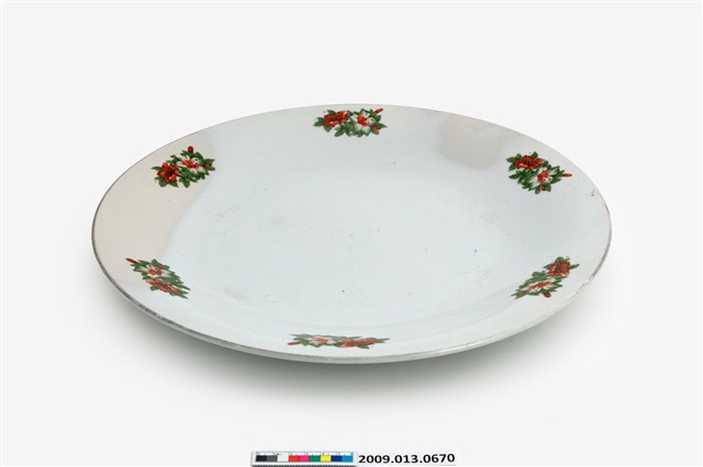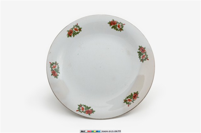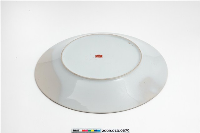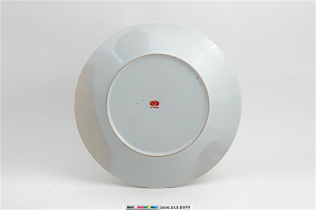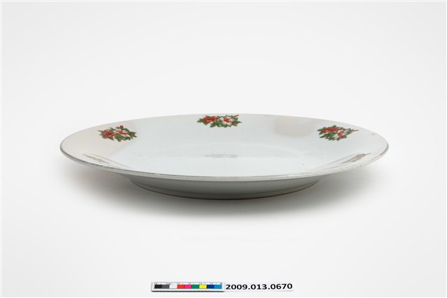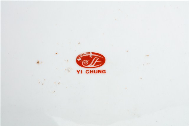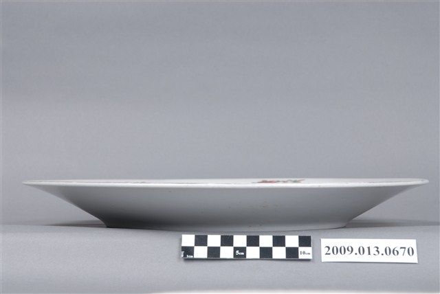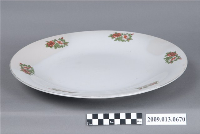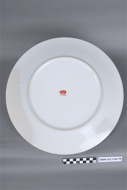 圓唇侈口、折沿,弧腹向圈足收斂,圈足露胎。口沿以銀彩繪圈紋,盤周點綴六組轉印印花百合花卉紋樣。百合分別以綠釉、紅釉繪製,靠近花心處留白且跳色暈染出花瓣的立體感,花朵與葉片描繪細膩寫實,紅綠花葉交錯別富趣味。盤底有「一止YI CHUNG」款識,應屬於瓷器公司之標章。因諧音「百年好合」,是常見於祝賀結婚喜慶的吉祥花卉之一,繪於日常使用的瓷器上除了裝飾美感外,更能沾沾吉祥喜慶之意。