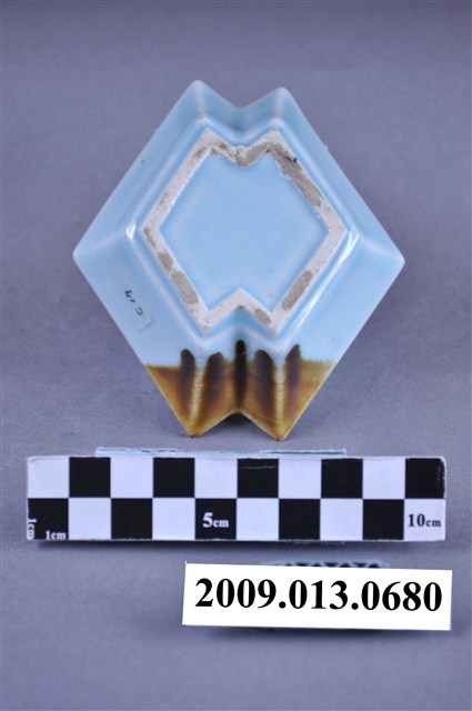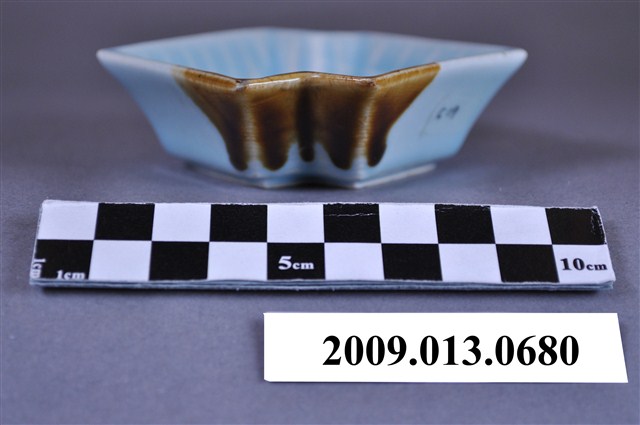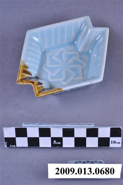 青瓷醬釉方形碟為高溫燒製且由模具成形,薄圓唇,平口,口沿微外侈,斜直壁下收,碟底緣方折,平收至圈足,圈足扁平,圈足露胎,胎色略黃。器形為多邊形,形似將兩個菱形相疊而成,因此全器呈不等邊的八邊形。全器施青色釉,釉面瑩潤,呈色較淺且略帶藍,不過器內壁以及圈足內圈有積釉。器形一端施深褐色釉,發色較淺且施釉不均,多處透露出底下的青色釉。器外壁素面無紋飾,僅以釉色變化為主。內壁則以突稜的線條裝飾,並模印出不同的紋樣:器壁模印出斜直線條或格子狀的紋飾,碟心則印出稜角狀重疊出來的花朵形裝飾。模印的紋樣與器形本身的線條設