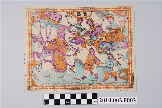 本件皇都市版印屏垛,題材取自董永與仙女的民間故事,寓意麒麟送子。畫面中左上方有一名手抱嬰孩的仙女,身邊圍繞仙女三名,眾仙女皆作立於雲端向下望的姿態。右上方有一座「皇都市」門額,畫面下方一名騎白馬的少年文官,身邊圍繞三名侍者,前面兩名肩扛長柄燈籠作開道狀,後面一名手持涼傘,四人作中試及第衣錦還鄉情景。畫面上方中央有「榮芳」字樣,林榮芳 (紙商)由林福全開設,為日治時期臺北市永樂町之紙商兼版畫作坊。全幅在墨色線條之下,套印朱紅、洋紅、石綠等色。