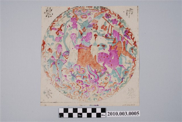 本件麻姑獻瑞版印斗方,其題材取自群仙齊赴瑤池為王母娘娘祝壽,麻姑前來獻酒祝壽的神仙故事。傳說陰曆七月十八日為王母娘娘壽誕日,麻姑在珠絳河畔以靈芝釀酒,獻予王母娘娘,稱為麻姑獻壽。本印斗方為圓形畫心,四個角落有「榮芳印製」,林榮芳 (紙商)由林福全開設,為日治時期臺北市永樂町之紙商兼版畫作坊。版畫以黑、石青、大紅、洋紅等套印而成,畫面中央麻姑面朝左方立於如意靈芝草之後,雙手捧一只花瓶,瓶中插有一株靈芝草,身後一童子舉芭蕉葉,身前下方一隻仙鹿作回首狀,左方一名侍女肩挑一只花籃,花籃內有仙果,回首望向麻姑,右方一名侍女手托一顆蟠桃,人物之間有畫卷、葫蘆、花卉等裝飾,整組仕女人物作行進狀,為民間常見的祝壽題材。