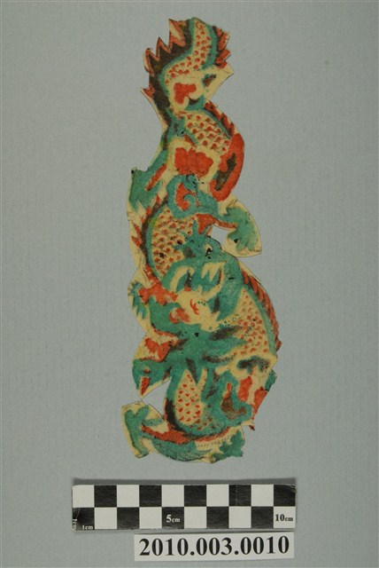 龍是古代最重要的吉祥神獸,為集合鹿角、蝦眼、牛嘴、狗鼻、人鬚、獅鬃、蛇身、魚鱗、鷹爪等動物之局部特徵而成,紋飾題材普遍見於繪畫、刺繡、織錦、瓷器、建築、家具等。由於明清時代以龍紋為帝王的主要象徵圖像,民間就將龍之爪減少一爪,並稱為蟒。蟠龍版印彩紙通常為一組兩件,主要做為糊紙作品之組件,常見於紙糊宮殿的柱子裝飾而成為龍柱。