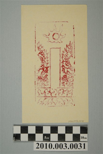 本件版印龍頭籤印記,以單一大紅色印製於米黃紙張之上。畫面以單線為外框,上方作一枚火珠,中央作一長條形方框,框內為書寫神祇名諱之處,兩側各一條降龍圖案,頭部相對矗拱方框,下端作寶相花造形之蓮花座。據入藏來源資料,本件木版來自宜蘭頭城茂惠紙店 (茂惠金香鋪)。