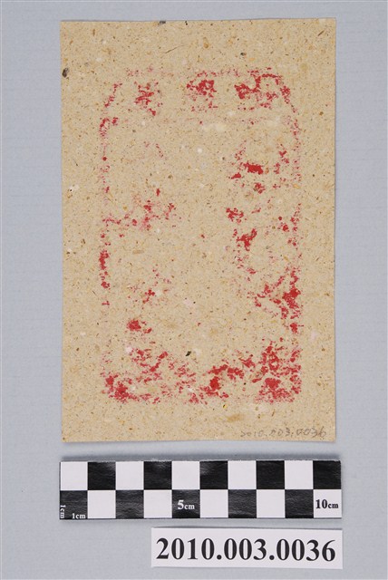 本件地獄錢紙錢採直幅構圖,以朱紅色印製在鵝黃色的草紙之上。上端梯形框內橫書「地獄錢」三字,下方框內並立兩位作獸首人身、著鎧甲的武將,左側為牛將軍,作牛頭人身,左手在上右手在下握一把三叉戟。右側為馬將軍,作馬頭人身,左手握腰帶,右手握一把尖端朝下的三叉戟於身後。據入藏來源資料,本件來自宜蘭頭城茂惠紙店(茂惠金香鋪)。