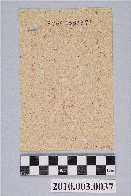 本件本命錢紙錢採直幅構圖,以朱紅色印製在土黃色的草紙之上。上端梯形框內橫書「本命錢」三字,下方框內中央作一名古代官員坐堂審判狀。官員頭戴烏紗帽,為文判官造形,案桌上有兩枚銅錢,案前一人雙手前撲,曲身作跪拜狀。據入藏來源資料,本件來自宜蘭頭城茂惠紙店(茂惠金香鋪)。
