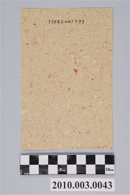 本件空亡錢紙錢採直幅構圖,以朱紅色版印製於土黃色草紙之上,上方梯形框內橫書「空亡錢」三字,下方框內作一道正面的城關,城門緊閉,城牆上站一名頭披髮的神吏,右手小臂上舉持一只拂塵。據入藏來源資料,本件來自宜蘭頭城茂惠紙店(茂惠金香鋪)。