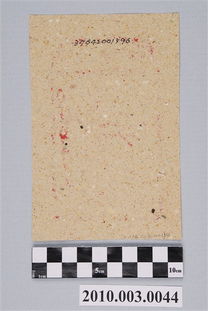 本件土煞錢紙錢採直幅構圖,以朱紅色版印製於土黃色草紙上。紙錢在上方梯形框內橫書「土煞錢」三字,下方框內站立一名煞神,頭戴八角冠,左手上抬,右手向內橫餘胸前,各持一把劍,跨坐於一匹頭部朝左,張口上仰的虎背上。據入藏來源資料,本件來自宜蘭頭城茂惠紙店(茂惠金香鋪)。