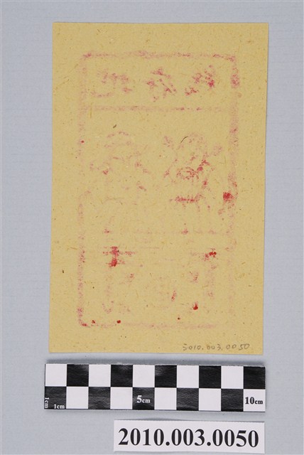 本件地府錢紙錢以朱紅色版印製於黃色草紙上,上方橫框內由右至左書「地府錢」三字,下方框內有為左右並列的文、武判官,文判官居右,頭戴烏紗帽,臉上無鬚,武判官居左,臉蓄長髯,兩判官立於一案桌前。據入藏來源資料,本件來自宜蘭榮芳號。