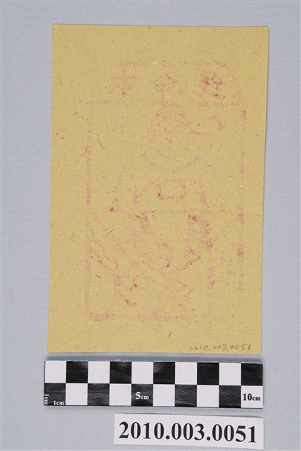 本件本命錢紙錢採直幅構圖,以單一朱紅色印製在土黃色的草紙之上。上方梯形框內橫書「本命錢」三字,下方框內中央作一名古代官員坐堂審判狀,官員頭戴烏紗帽,為文判官造形,案桌上有兩枚銅錢,案前一人面朝左方,雙手前撲,曲身作跪拜狀。據入藏來源資料,本件來自宜蘭榮芳號。
