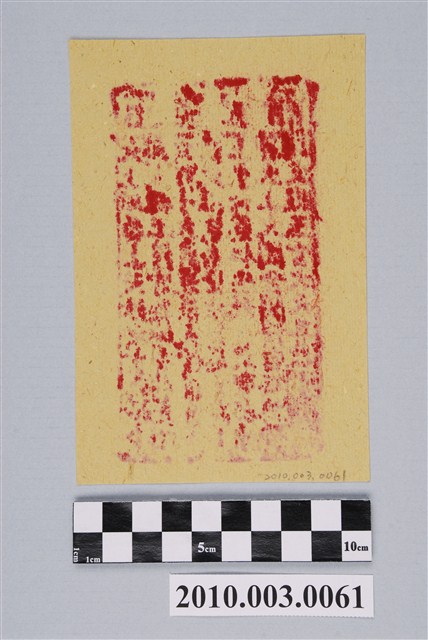 本件玉皇寶誥紙錢採直幅構圖,以朱紅版印製於黃色草紙上。紙錢在上方橫框內橫書「玉皇寶誥」四字,下方長方形框內作七行文字,字跡線條模糊不易辨識。根據道經所載玉皇寶誥原文為:「太上彌羅無上天,妙有玄真境,渺渺紫金闕,太微玉清宮,無極無上聖,廓落豁光明,寂寂浩無宗,玄範總十方,湛寂真常道,恢漠大神通,玉皇大天尊玄穹高上帝。」但民間紙錢之文字多有差異。據入藏來源資料,本件來自宜蘭金成利金紙舖。