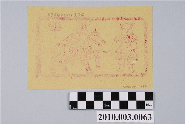 本件甲馬紙錢作橫幅式,以朱紅色版印製於黃色草紙上,畫面作左右寬的粗線方框,右上方有「甲馬」二字,左側一名身穿蓑衣蓑裙的馬伕,正面朝前,雙手合拉一條疆繩,繩子連接右側一匹紅色戰馬,馬背披有馬鞍,馬臀與馬鞍有菊花紋。據入藏來源資料,本件來自宜蘭金成利金紙舖。