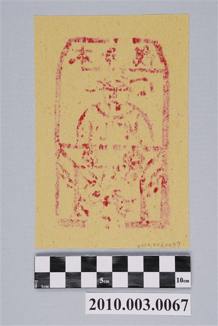 本件本命錢紙錢採直幅構圖,以朱紅色版印製在土黃色的草紙之上,紋樣線條部份缺損。紙錢在上方梯形框內橫書「本命錢」三字,下方框內中央作一名古代官員坐堂審判狀,官員頭戴烏紗帽,為文判官造形,案桌上有兩枚銅錢。據入藏來源資料,本件來自宜蘭金成利金紙舖。