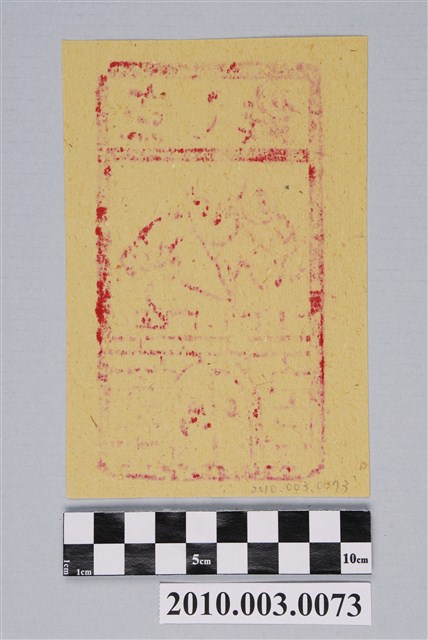 本件空亡錢紙錢採直幅構圖,以朱紅色版印製於土黃色草紙之上,上端文字及圖案線條有缺損。紙錢上方橫框內書「空亡錢」三字,下方框內作一道正面的城關,城門緊閉,城牆上站一名頭長雙角的神吏,右手小臂上舉持一面旗子。據入藏來源資料,本件來自宜蘭金成利金紙舖。
