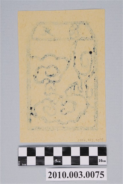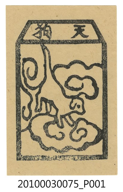 本件天狗紙錢以墨版印製於黃色草紙上,上方梯形框內橫書「天狗」二字,下方框內作一隻白狗,頭部朝右下方,高翹尾巴,四肢站立於雲朵上,身體兩側亦有雲紋。據入藏來源資料,本件來自宜蘭。