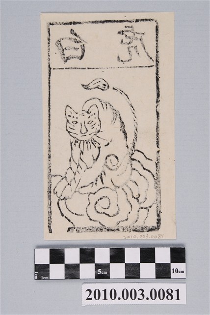 本件白虎紙錢印記以墨版印製於白色紙張之上。紙錢在上方橫框內書「白虎」二字,下方框內作一隻白虎,後肢蹲坐,前肢伸直,尾巴高翹,坐於雲朵之上。
