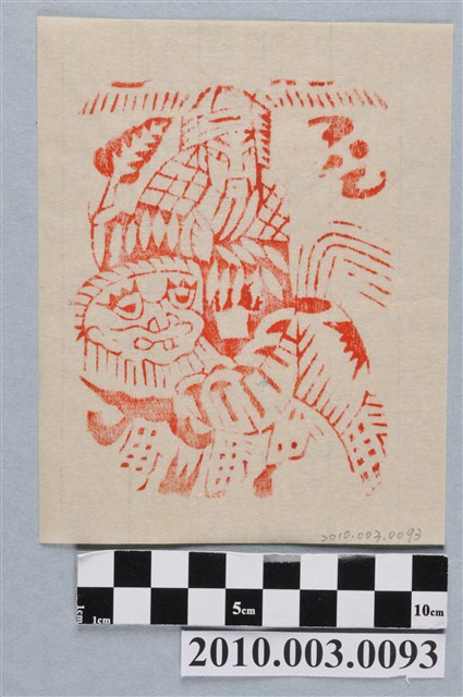 本件壽金紙邊印記以朱紅色版印製於米黃色紙張之上,印記雕版為日治時期製品,用於壽金紙邊戳印。印記作上下略長的方形,畫面作一名跨坐在獅子背上的神祇圖案,為福神。神面朝左方,頭戴官帽,冠之兩側有羽毛狀裝飾向兩側平伸,臉蓄長髯,右手於胸前拂髯,左手小臂上舉持一把蕉扇,頭部左方有一隻蝙蝠,取「福」之諧音。