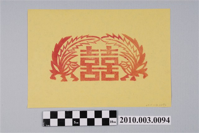 本件壽金紙邊印記以朱紅版印製於黃色紙張之上,印記雕版為日治時期製品,用於金紙之紙邊戳印。印記作橫式圖案,面幅中央為「囍」字,左右兩側為頭部朝中央的鳳鳥紋樣,多用於蓋印壽金紙邊之印記,本印記用於小面幅財子壽壽金。