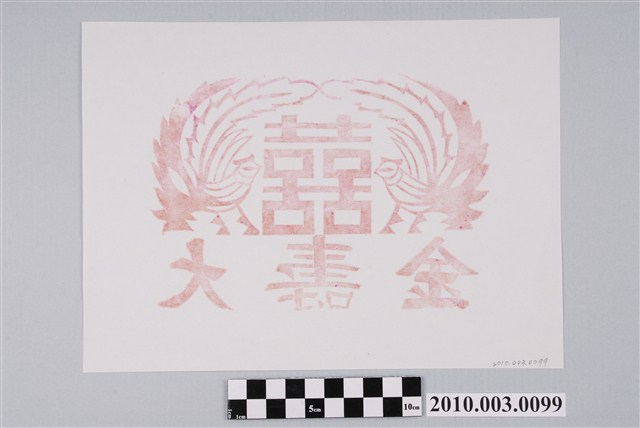 本件壽金紙邊印記以朱紅色版印製於白色紙張之上,印記雕版為日治時期製品,用於金紙之紙邊戳印。印記作橫式圖案,面幅中央為「囍」字,左右兩側為頭部朝中央的鳳鳥紋樣,下方加上「大壽金」三字,多用於蓋印壽金紙邊之印記,本印記用於大面幅之壽金。