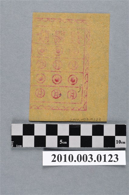 本件陰陽錢紙錢以朱紅版印製於土黃色草紙上,紙錢邊框以外框直線與內框半圓相連之曲線所組成,右側線框因裁切之誤而缺損。外框內又區分為五列橫框,最上一列框內橫書「陰陽錢」三字,其下四框各有三枚銅錢,二、四列銅錢式樣相同,作中心為圓點之同心圓,三、五列銅錢為外圓內方式樣,以示有陰、陽之別。