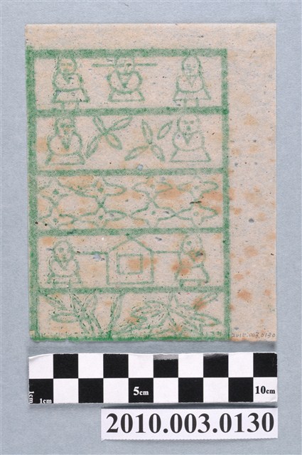本件雲馬紙錢以綠色版印製於米白色紙張之上,紙面有受潮所產生之黃色污漬。紙錢畫面由上至下區分為五格,第一格作一名頭戴展翅官帽之神,左右一老一少兩名侍臣,第二格左右各一人,中央為兩道十字竹葉紋,第三格為兩列八朵十字花瓣紋,第四格為兩人抬一轎,最下方一格為一株掌葉十字花卉紋。據入藏來源資料,本件來自宜蘭羅東正義紙莊。