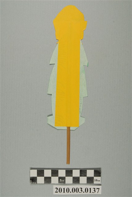 本件煞神紙像,為宜蘭市林陳阿嬌(又名阿巧)所製,頭部以墨版印製在米黃色紙張之上,根據外沿剪裁後,張貼於以綠色紙剪裁的身軀上,背後黏上一根竹籤以利立起。煞神紙像頭戴眉冠,雙眼圓睜,虯髯,身軀外形簡略,約略顯示雙手、上衣下襬與雙腳,身軀部位有兩道直向褪色痕跡。