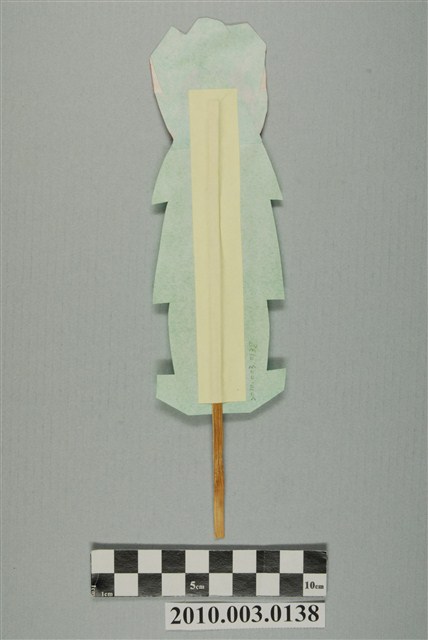 本件孩童替身,為宜蘭市林陳阿嬌(又名阿巧)所製,作男孩面貌,紙像頭部以墨版印製在紅色紙張之上,根據外沿剪裁後,張貼於以綠色紙剪裁的身軀上,背後黏上一根竹籤以利立起。孩童替身紙像頭頂盤單一髮髻,兩側垂髮,身軀外形簡略,約略顯示雙手、上衣下襬與雙腳,身軀部位有兩道直向褪色痕跡。