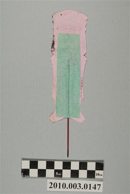 本件煞神紙像以墨版印製在粉紅色紙張之上,只有頭部有紋樣,頭部以下僅約略剪裁出身軀與雙腳,背後黏上一根香腳以利立起。煞神紙像頭戴盔冠,頭部兩側垂髮,面部兇惡。據入藏來源資料,本件來自宜蘭市進安壇。