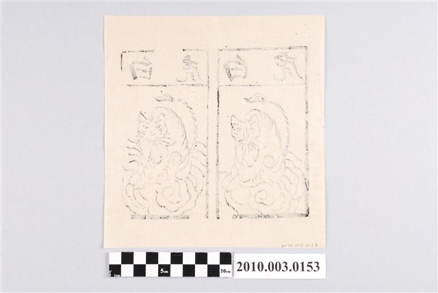 本件白虎紙錢印記以墨版印製於白色紙張之上,畫面為兩個相同之圖案並列印製,原印記為日治時期製品。紙錢在上方橫框內書「白虎」二字,下方框內作一隻虎煞,後肢蹲坐,前肢伸直,尾巴高翹,坐於雲朵之上。