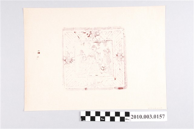本件壽金紙面印記以絳紅色版印於米黃色紙張之上。畫面主體為福祿壽三仙圖案,民間稱為財子壽,三仙圖案以福仙居中,祿仙居福仙之左,壽仙居福仙之右,三仙上方橫書「祈求平安」四字。四周邊框紋樣作蓮花、方迴文,蓮花居四邊之中央。