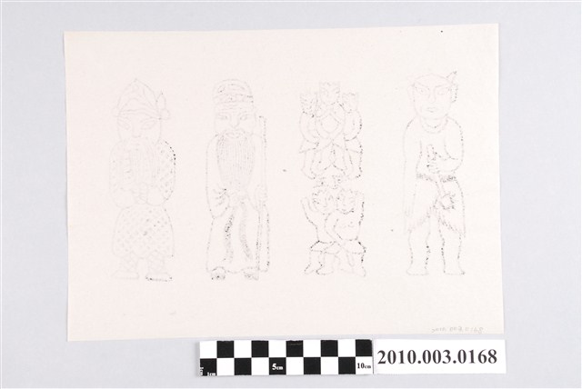 本件神煞紙像印記以墨版印製於白色紙張之上。畫面由左至右排列四位煞神像:陰鬼、五鬼、土地神、山神。陰鬼像作頭長兩犄角,頸上有項圈,赤裸上身,下身穿兩片式草裙,赤足,右手倒持一把釘槌。五鬼像作兩群鬼,上方三名、下方兩名,中央有「五鬼」兩字,每位鬼皆作頭長犄角、上身赤裸裝束,下身穿短裙。土地公像作老人狀,頭戴員外帽,長髯垂胸,身穿及腳背之長袍,右手拄杖。山神像作古代武將裝束,雙眼圓睜,頭戴戰盔,長髯垂胸,身穿鎧甲,雙手合抱於腹前。據入藏來源資料,本件來自宜蘭頭城茂惠紙店(茂惠金香鋪)。