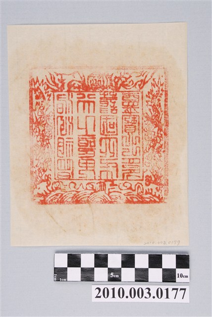 本件鹿港天后宮天上聖母寶璽印文,以朱紅色印泥鈐印於米黃色紙張之上。寶璽印面作正方形,每邊約十公分,在粗線外框內作一道花紋框,上方框內正中為火珠紋,兩邊各有草葉紋,兩側框內作一對降龍紋,龍頭朝向印文中心,下方框內作海浪、山嶽紋。印文中心方框內以小篆體直書四行十六個文字:「湄洲祖廟天上聖母護國庇民靈寶之印」。
