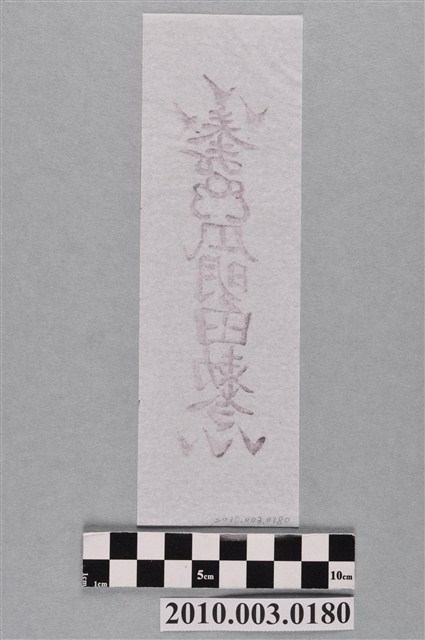 本件張天師鎮宅平安符以墨版印製於白色紙張之上,符頭作三個V符號,象徵道教至尊三清道祖,符身最上方書「奉」字,其下為道教秘文,以中央一「○」以及左右兩旁之ε、3形文所組成,下方分別為「瓜明甶勅令」,符腳押三個V符號,為少見的形式。據入藏來源資料,本件來自宜蘭市進安壇。