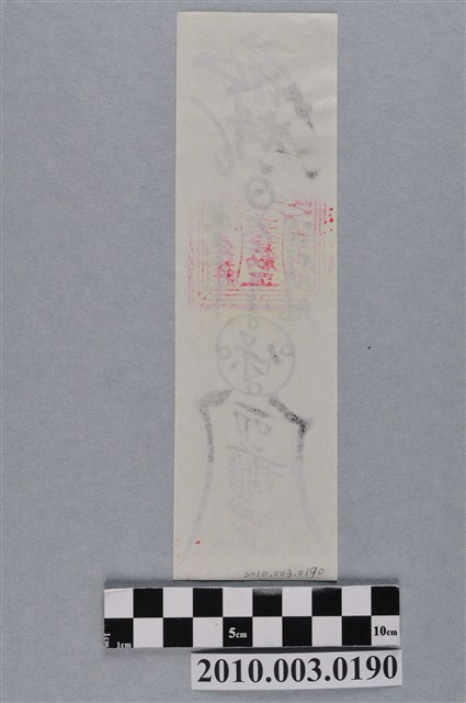 本件保命護身符以墨版印製於黃色紙張之上,並加蓋一方朱紅法印而成。符頭在「雨」字之下橫書「火、」「斗」二字,三字複合為道教天罡之諱號,其下三個V符號,為道教至尊神三清道祖之象徵,其下在一圓圈內作一點,為太極符號之簡化,亦象徵太陽星君。符身最上方直書三行文字,中央為「太上台星」,為太上老君與三台星君,左右各書「應變無亭(停)」、「驅邪縛魅」,並加蓋一方「太上老君勅罡」朱文法印。其下在一個周邊繞出四小圈的大圓內書一「保」字,「保」下接「命」字,並以兩撇往下延伸出寶蓋,下方書「護身」複合字,符腳押一「罡」字。