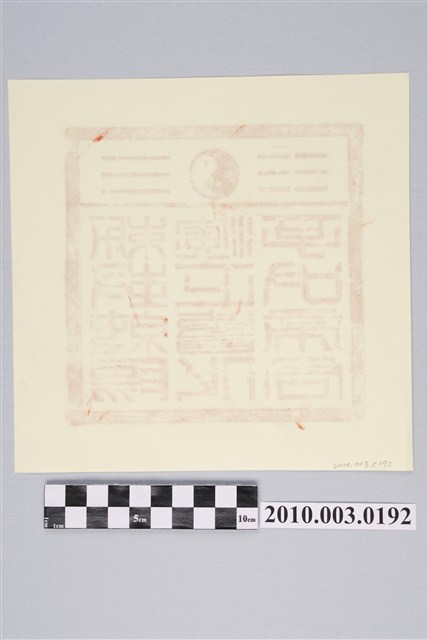 本件孚佑帝君法印印文以朱紅色印泥鈐印於米黃色紙張之上。印文作正方形,以粗線為方框,框內以橫線區分為上下兩部份,上方一列中央作太極圖,右、左兩側為乾、坤二卦。下方篆書三行十二字朱文:「勅封純陽演正警化孚佑帝君」。