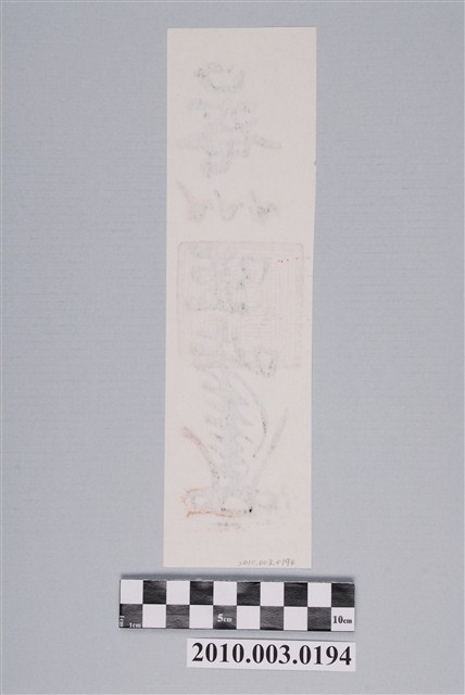 本件佛教淨符為民間常見的洗淨、淨身用符令,以墨版印製於米黃色紙張之上,並加蓋一方法印而成。符頭書一個口字旁在上的「唵」字,其下三個V符號,象徵佛教之三寶佛。符身直書「啞吽」二字,吽字豎畫往下延伸後向左上方挑起作七折疊於筆畫上,啞吽兩字上蓋一方朱紅法印,印文為篆體朱文「佛法僧寶」,符腳作花押罡圖。