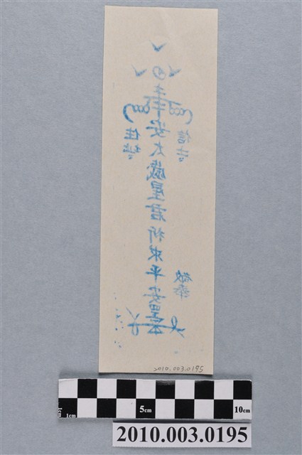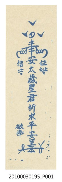 本件安奉太歲符為印記拓印,以藍色版印製於白色紙張之上,原符在使用時多用紅紙墨版印製。太歲符符頭作三個V符號,一上二下排列,為道教至尊神三清道祖之象徵,下方兩V之間作一個簡化之太極圖,亦可象徵「日」。符身最上方作一大「奉」字,兩撇分別往左右延伸並結三個小圈,筆畫尾端內勾,其下直書「安太歲星君祈求平安罡」,右上方直書「住址:」,其下為填寫信眾住址處,左上方直書「信士:」,左下方直書「敬奉」,中間為填寫信眾姓名處,符腳作六壬罡花押。