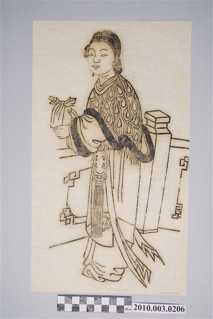 本件侍女像以單一墨色印製於白色紙張之上,線條有暈開現象。侍女作古代立姿仕女造形,額上有瀏海而頭上無髮髻,面朝右方,身穿窄袖長袍,上身披水滴紋雲肩,手肘間垂有飄帶,雙手在胸前合持一只包巾之法印,腰前掛一只如意型佩飾,流蘇垂至腳部,身後作高度及腰的石欄杆背景。