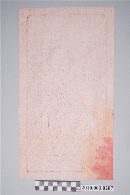 本件臨水夫人神禡以墨版印製於紅色紙張之上,為神禡形式之符令,民間俗稱大符。畫面以粗細雙線為外框,框內上端開一橫框,內部空白,下端橫框內作一朵寶相花纏枝花卉紋。主體框內中央作臨水夫人之像,夫人身穿長袍法衣與如意雲肩,頭上有飄帶垂至角部,左手上舉持一只法角,右手下垂反握飄帶。頭部上方、左方及上身右方有雲朵紋。兩側作一對降龍圖案,兩龍之頭部朝向中央上方夫人頭部。