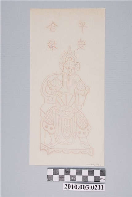 本件大眾爺神禡,以朱紅色版印製於米黃色紙張之上。畫面中作一位斜坐於圈背椅上的大眾爺像,上方直書「合境」、「平安」兩行字。神像作古代武將造形,神像怒目、虯髯,頭戴戰盔,身穿甲冑,腹前有獅頭紋,為武大眾爺。右手置於右膝之上,左手握胸前看帶,左腿屈膝,右腿向外直伸,神像之造形與線條具有明顯拙趣。據入藏來源資料,本件來自宜蘭縣五結鄉錦眾村大眾爺廟。