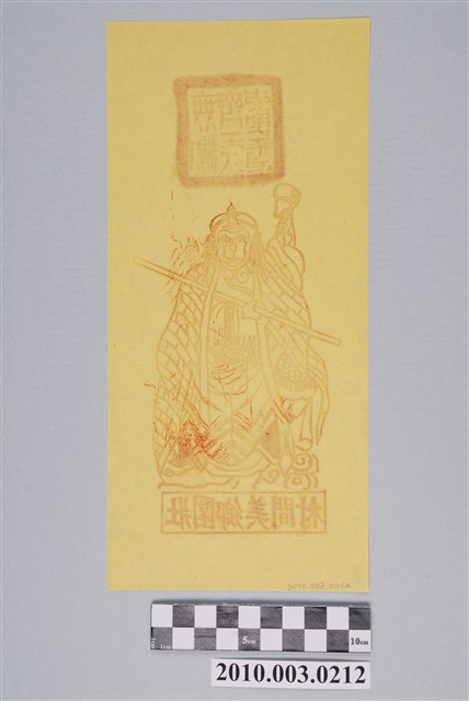 神禡即印製神祇畫像的符令,俗稱大符,具有供奉神祇、鎮守之意。齊天大聖即《西遊記》中的孫悟空,其信仰最晚在宋代即已出現,稱「西方鬥戰勝佛齊天孫大聖」。在民間話本中,孫悟空因大鬧天宮被如來佛祖鎮壓在五指山下。後遇唐僧解救後隨其赴天竺取經,沿途降魔除妖,最後取得佛經返回中土而證得果位,被封為「戰鬥勝佛」,故民間俗信大聖具有降魔之法力。