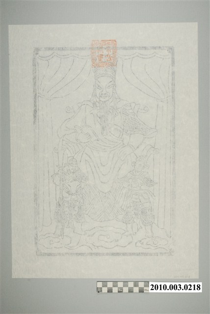 本件關聖帝君神禡以墨版印製於白紙之上,在神像頭頂加蓋一方「關聖帝君」朱文法印。畫面作長方形線框,框內兩側帳縵中央端坐關聖帝君之像,帝君身穿文武甲,頭戴布巾,鳳眼垂髯,右手置右膝上,左手托一冊書作讀春秋狀。下方兩位副將分立左右,左邊為周倉,左手持大刀,右邊為關平,雙手捧印信。畫面下端有雲朵紋樣,全幅神禡未有文字。據入藏來源資料,本件來自宜蘭林灶神壇,與登錄號2010.003.0217圖像相同。