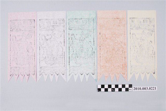 本組天官賜福掛箋為五幅一組,以墨版分別印製於黃、紅、淺綠、靛紫、洋紅等紙張之上,以同一件雕版印製。每一幅掛箋皆作長條形,下端作鋸齒形剪裁,最上端在雙線方框內書「天官賜福」,畫面中央主要為天官之像。天官作古代文官造形,頭戴展翅相帽,身穿官袍,臉蓄五柳長髯,左手上舉,右手左伸於腹前,合持一方捲軸。天官左後方立一名手持長柄羽扇之侍女,身右立一孩童,上下各有一道黑底之捲草紋花邊,最下端作花朵紋。