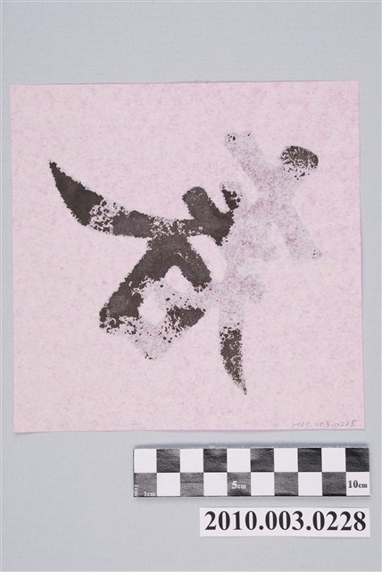本件春字版印斗方以墨版印製於洋紅色紙張之上,斗方作四邊等長之菱形,其上印一「春」字,字體為柳體楷書。