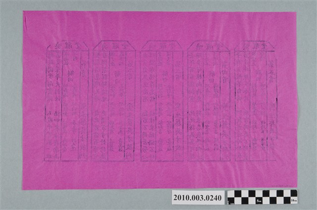 本件為木雕印版所印刷的宜蘭頭城喚醒堂籤詩,本張紅紙印刷第一至第五首籤詩。籤詩頭刻有「喚醒堂」,下方有籤詩序號、內容、歷史典故、諸事吉凶、捐獻者姓名。喚醒堂創立於光緒21年(1895)主祀神五恩主為一鸞堂。一套籤的數量有36、60、100、120等等,籤詩普遍涵蓋人生面相的正負解釋,藉由解籤人或求籤人的主客觀判斷,解惑尋求化解之道,是民眾的一種心理諮商管道。