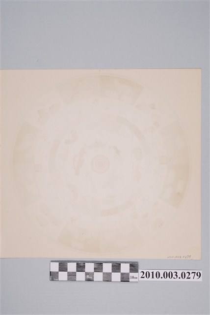 本物件為射標紙圖,材質為紙質,成圓形,由內而外之逆時針同心圓為;「戰艦、摩托車、飛機、火箭、汽車」;「鼠、牛、虎、兔、龍、蛇、馬、羊、猴、雞、狗、豬」;「1、2、3、4、5、6、7、8、9、10、11、12、13、14、15、16、17、18」;紅字「團結奮鬥消滅共匪還我河山增產報國反攻大陸解救同胞」;「小小小中小小小大小小小特大小小小中小小小大小小小中小小小大小小小中小小小特大小小小大小小小中小小小大」;「二鼠一馬、三龍、二虎一兔、三鼠、二龍一牛、三兔、二馬一鼠、三牛、二兔一虎、三馬、二牛一龍、三虎」。左上方蓋有藍色印章「臺北榮昌玩具行」。