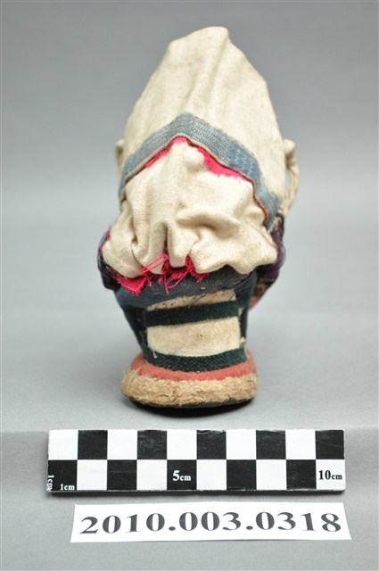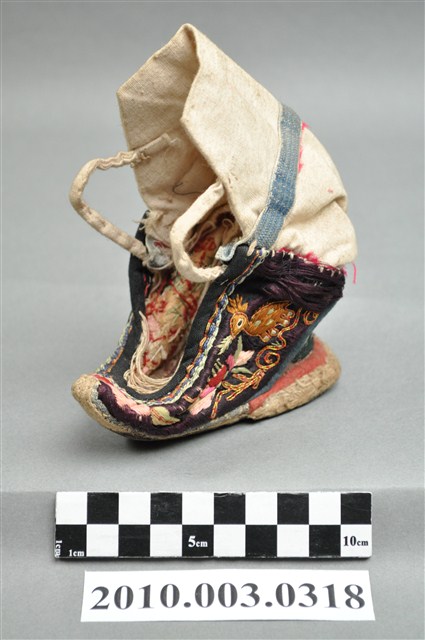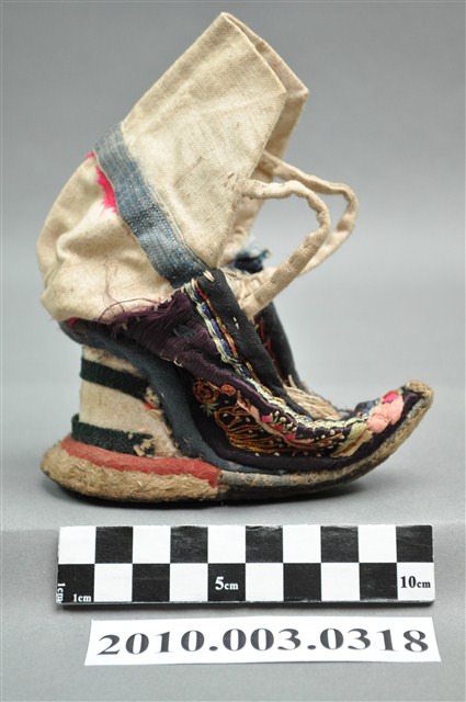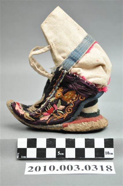 本文物為鹿與花草刺繡三寸金蓮右鞋,布質。樣式為多層縫布及刺繡,鞋身布料花色從上至下依序為白底藍帶綁腳布,鞋身則為藍色、紫色、粉色、黃色之鹿與花草刺繡。三寸金蓮又被稱作「金蓮杯」,為中國婦女纏足時所穿之鞋。纏足為自宋代以來漸行的風俗,有一說為將女性的腳纏成弓狀、腳踩金蓮杯,可使其走路時呈現婀娜多姿之貌,因此受到多人喜愛,且也有人將纏足的大小作為一種審美標準。但纏足限制女性行動、勞動力,該行為被後來的婦女解放運動批評為是一種父權社會禁制女性的手段。根據日治時期的舊慣調查,清代臺灣有許多女性纏足,而總督府為增加臺灣更多勞動力,因此鼓吹放足運動,使得臺灣纏足女性逐漸減少。