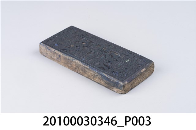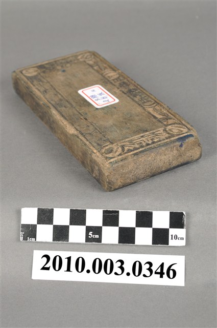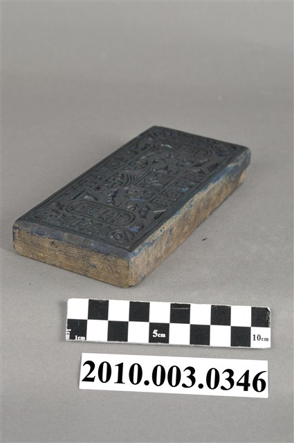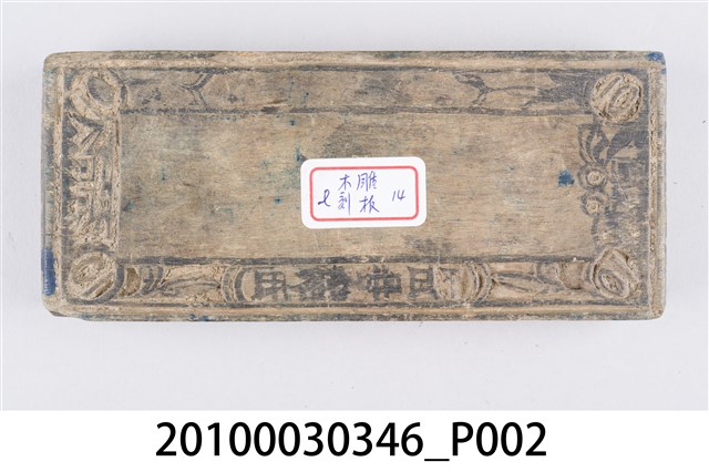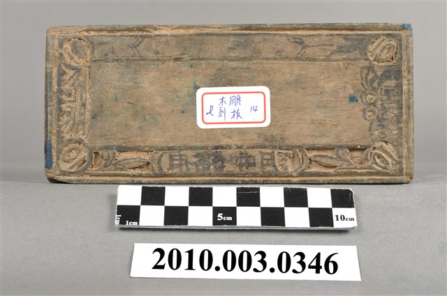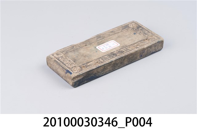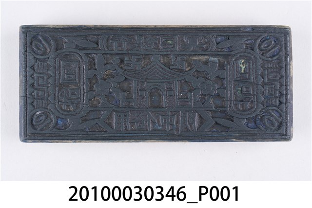 本物件為木雕的印版,為凸版印版,刻版上有「冥國銀行」以及「拾圓」文字,印製於長方形冥紙。印版文字及圖案清晰,唯「冥國」2字有破損情形。印版木頭有橫向裂痕,另一面有些需刻紋雕花及黑色墨線,疑似雕版製版時的線稿,但並未完成。